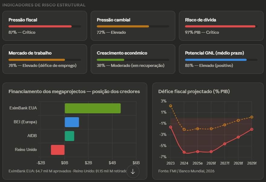 O aviso surge num momento crítico para os megaprojectos de GNL. O projecto Mozambique LNG, liderado pela TotalEnergies e avaliado em 20 mil milhões de dólares, retomou formalmente as operações em Janeiro de 2026, após quatro anos de suspensão. O projecto Rovuma LNG, da ExxonMobil, aguarda decisão final de investimento, e a Eni avança com o Coral Norte. O panorama de financiamento internacional permanece dividido: o banco de exportação dos Estados Unidos aprovou um empréstimo de quase 5 mil milhões de dólares para apoiar o Mozambique LNG, enquanto o Reino Unido retirou o seu compromisso de 1.15 mil milhões de dólares, citando preocupações de segurança e orientações de política climática.
