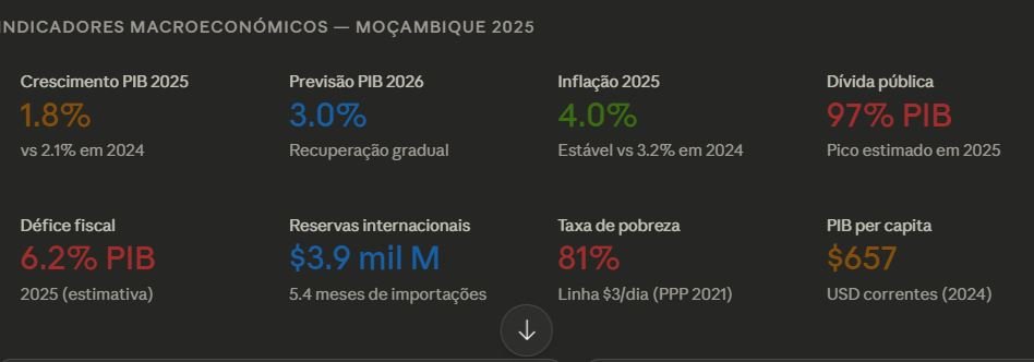 Esta leitura assenta no Mozambique Economic Update: From Fragility to Stability, publicado pelo Banco Mundial em março de 2026 em conjunto com o FMI, que traça um diagnóstico claro sobre os desafios de curto e médio prazo. Os sinais são inequívocos: a economia contraiu 2.4% em termos reais no primeiro semestre de 2025, reflexo direto das perturbações pós-eleitorais, das pressões cambiais e da deterioração da confiança dos investidores. O crescimento do PIB deverá situar-se em 1.8% em 2025, recuperando gradualmente para 3.0% em 2026 e 3.5% em 2027.