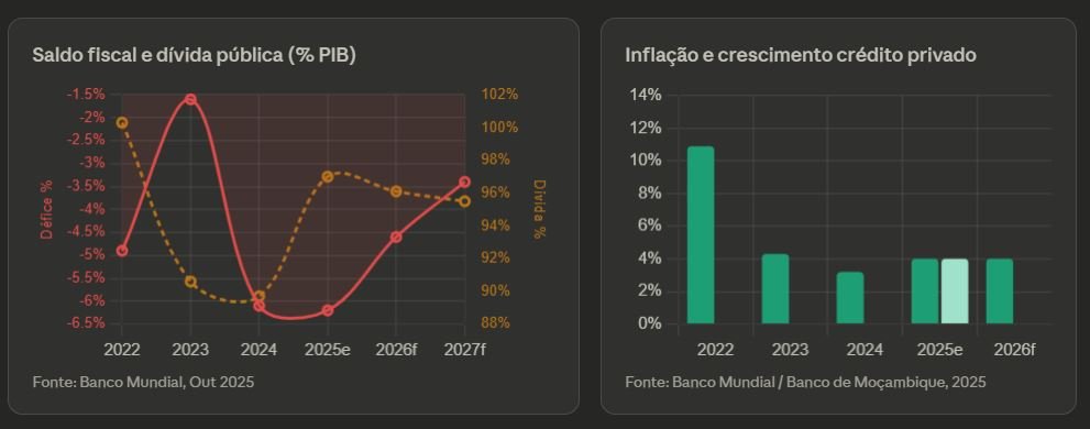 No plano monetário, há sinais mais encorajadores. A inflação recuou para 4% nos primeiros sete meses de 2025, beneficiando da melhoria do comércio transfronteiriço com a África do Sul, que contribuiu para baixar os preços alimentares. O Banco de Moçambique aproveitou esta janela para afrouxar a política monetária, reduzindo a taxa de referência para 10.25% em julho de 2025. Ainda assim, o crédito ao sector privado mantém-se contido, crescendo apenas 4% em termos homólogos no primeiro semestre de 2025.