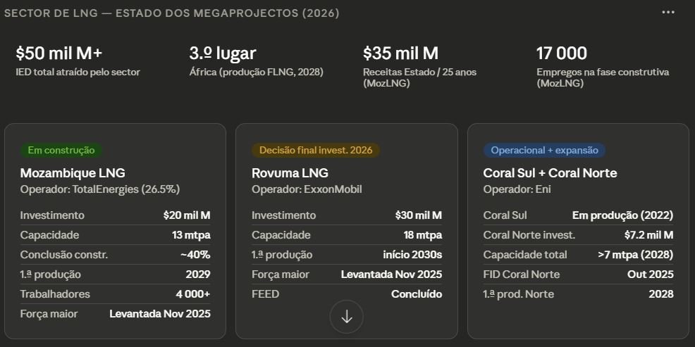 O projeto, avaliado em 20 mil milhões de dólares, estivera suspenso desde 2021 na sequência dos ataques insurgentes em Palma. O custo total escalou entretanto em cerca de 4.5 mil milhões de dólares devido às paragens, e a TotalEnergies solicitou uma extensão de dez anos da concessão de produção. A ExxonMobil levantou igualmente a força maior no seu projeto Rovuma LNG, avaliado em 30 mil milhões de dólares, abrindo caminho para uma decisão final de investimento em 2026 e primeiras exportações no início da década de 2030.